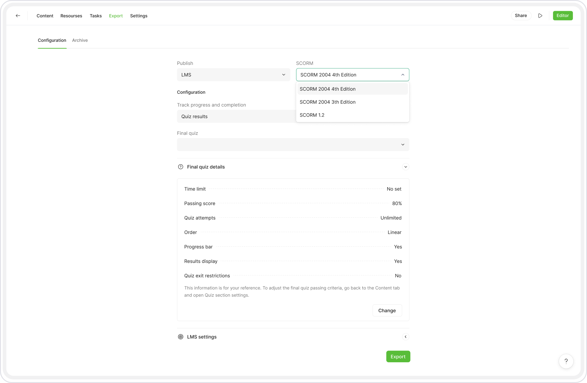 Customize your SCORM export settings to match your specific LMS requirements. Set completion and progress criteria, adjust the threshold for the final test, and tailor other settings as needed.
