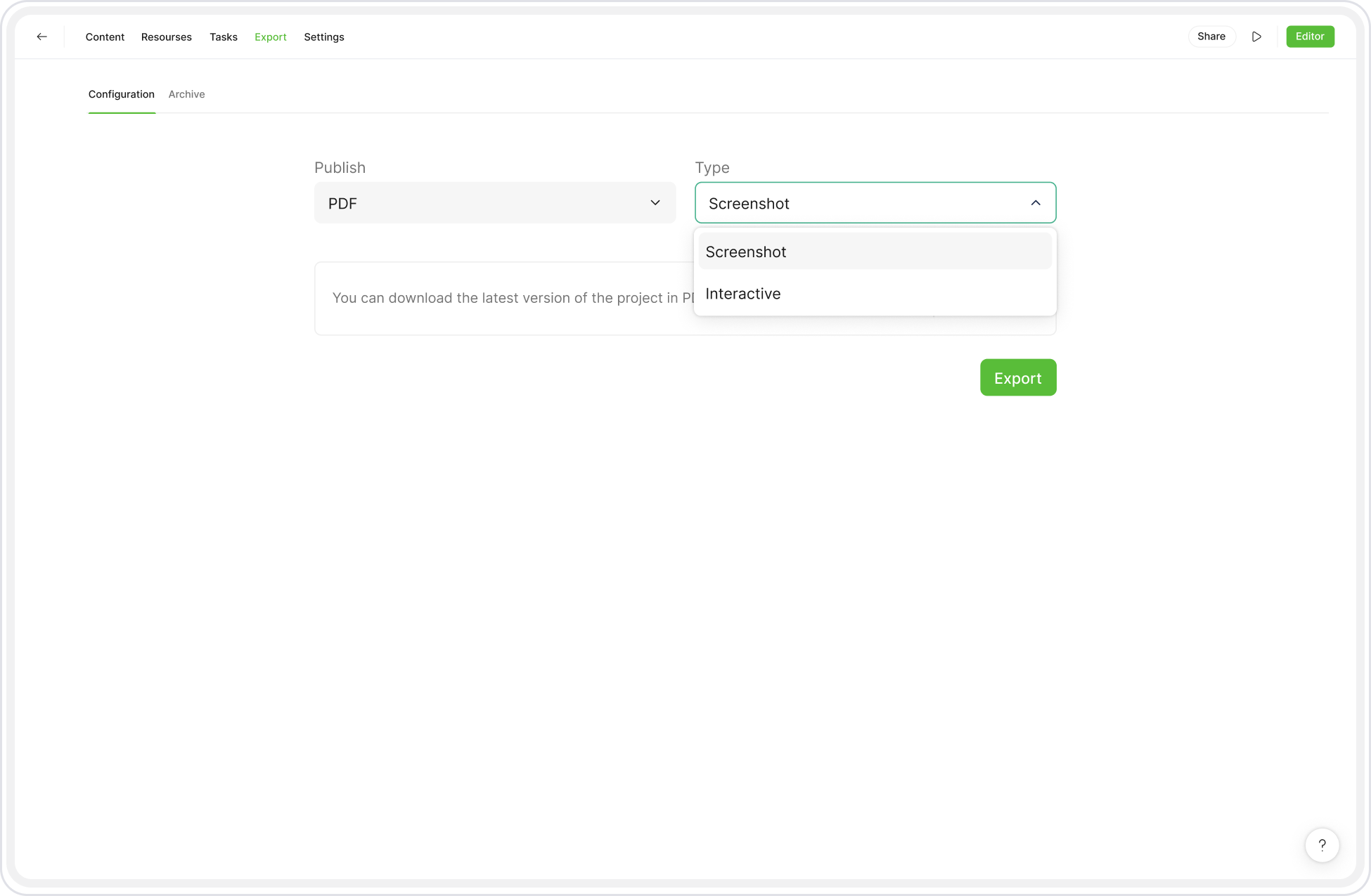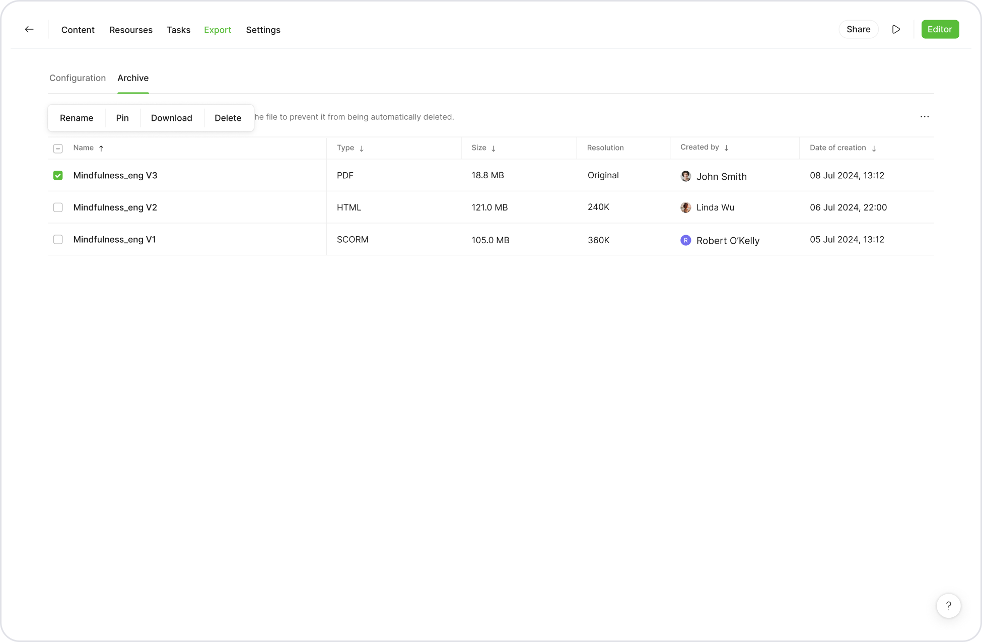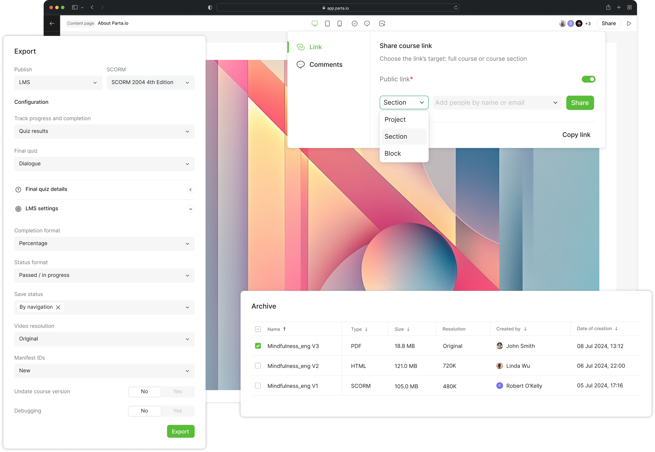 Deeply customize SCORM export settings and benefit from automatic version recognition when re-uploading courses to your LMS. Easily access all your export history.