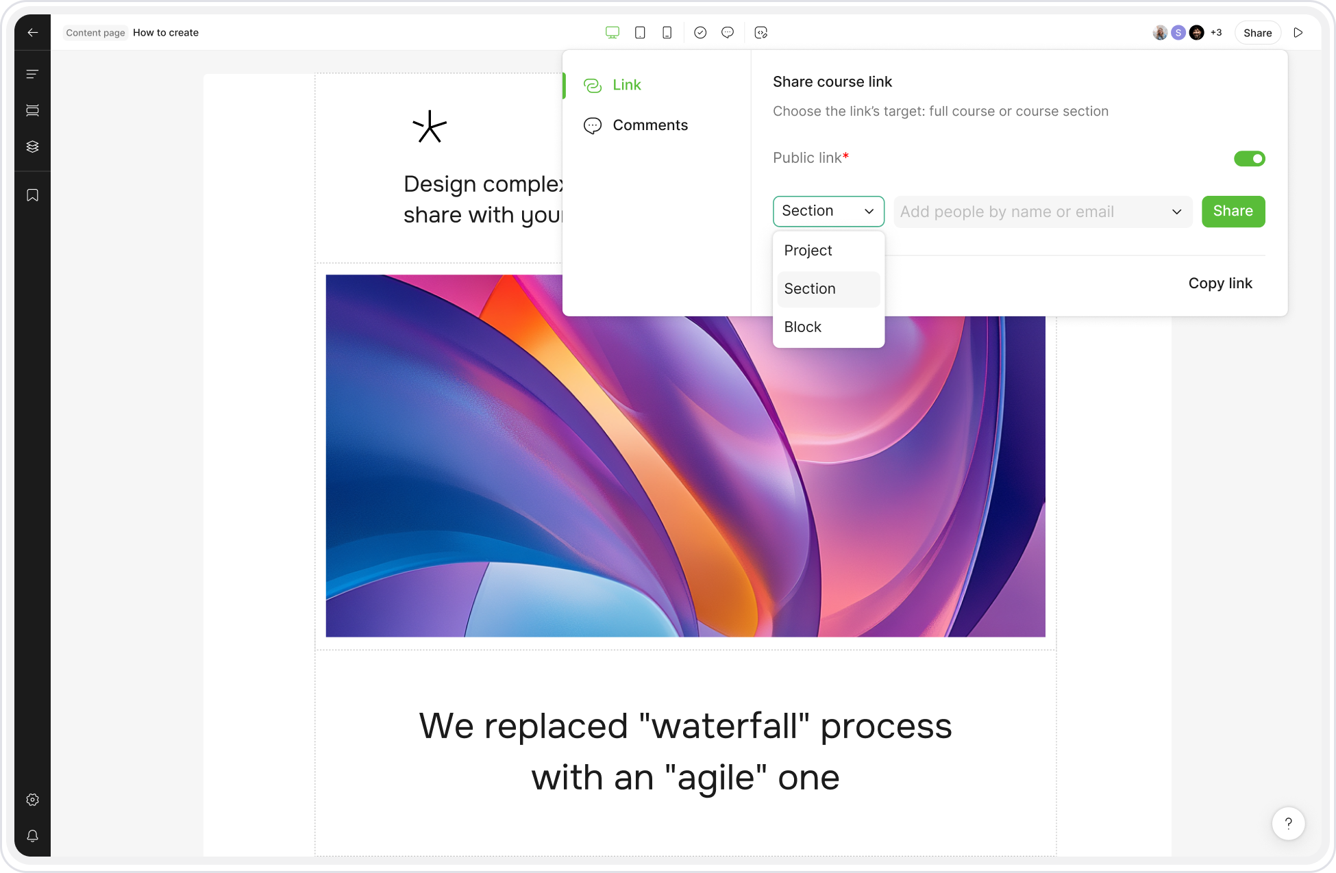 Share content easily by creating and sending public links to a full course, a section, or even a content block.
