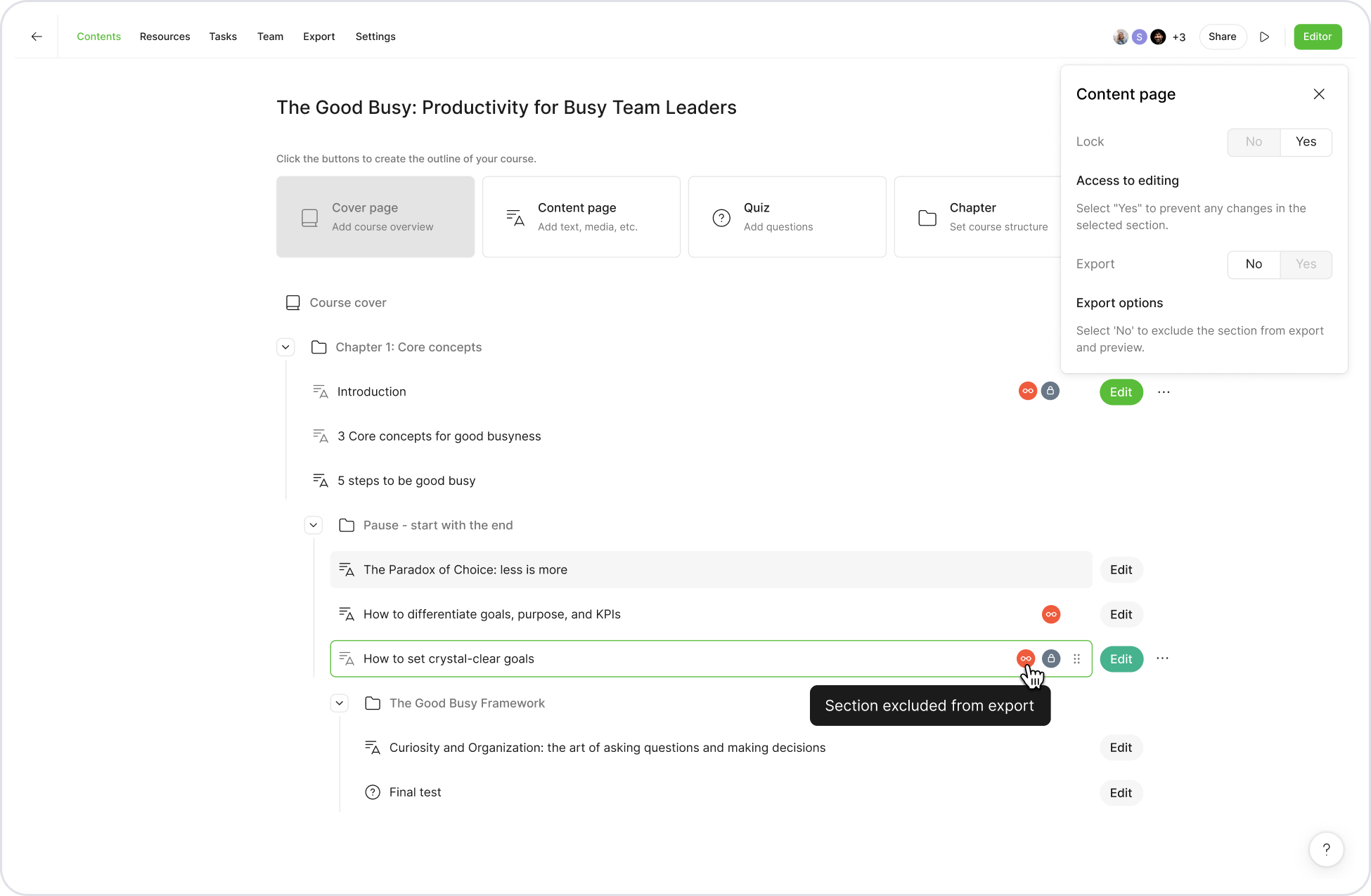 Exclude course sections or content blocks to customize your exports for different audiences. Hidden content will not appear in SCORM packages, HTML files, or public links.