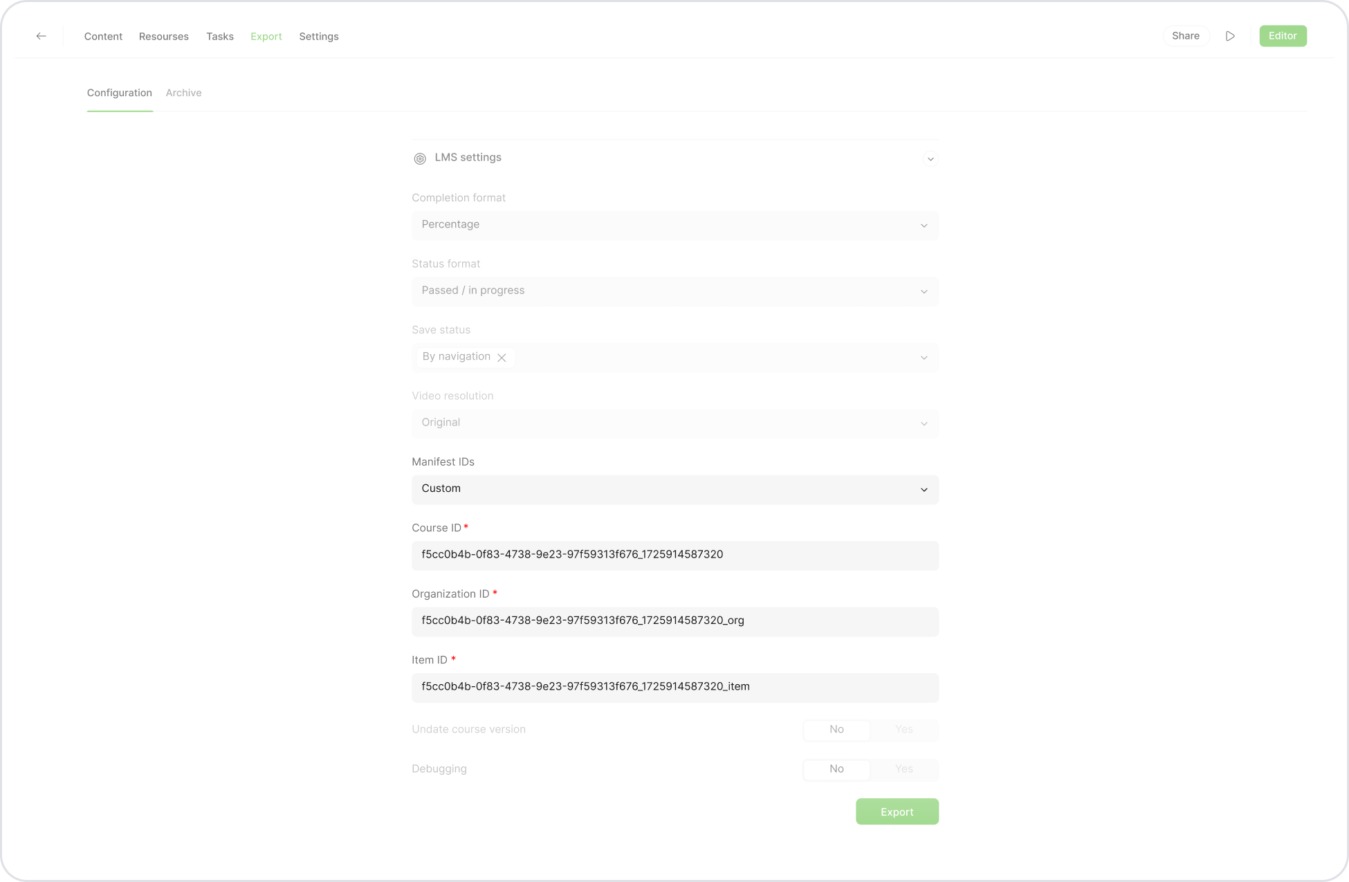Update your course without disrupting ongoing learners by selecting ‘Custom ID’ during export and using the same ID as the previous version. When re-uploaded, the LMS admin will be prompted to either update or retain the current version.
